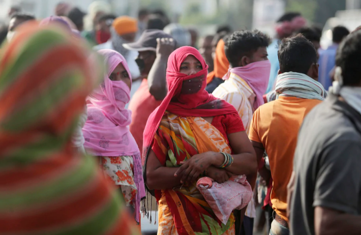 Migrant laborers from other states looking for work gather on a street on the outskirts of Jammu, India on Sunday. (Channi Anand/AP)