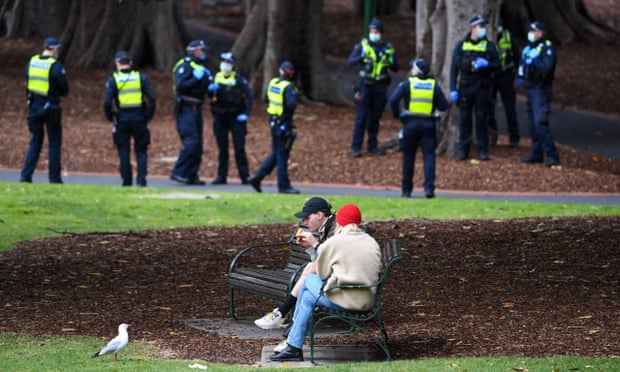 A couple enjoy a break while police patrol Treasury Gardens in Melbourne over the weekend. During Victoria’s first wave of coronavirus, approximately 42% of those fined for breaching gathering rules were under the age of 24. Photograph: William West/AFP/Getty Images