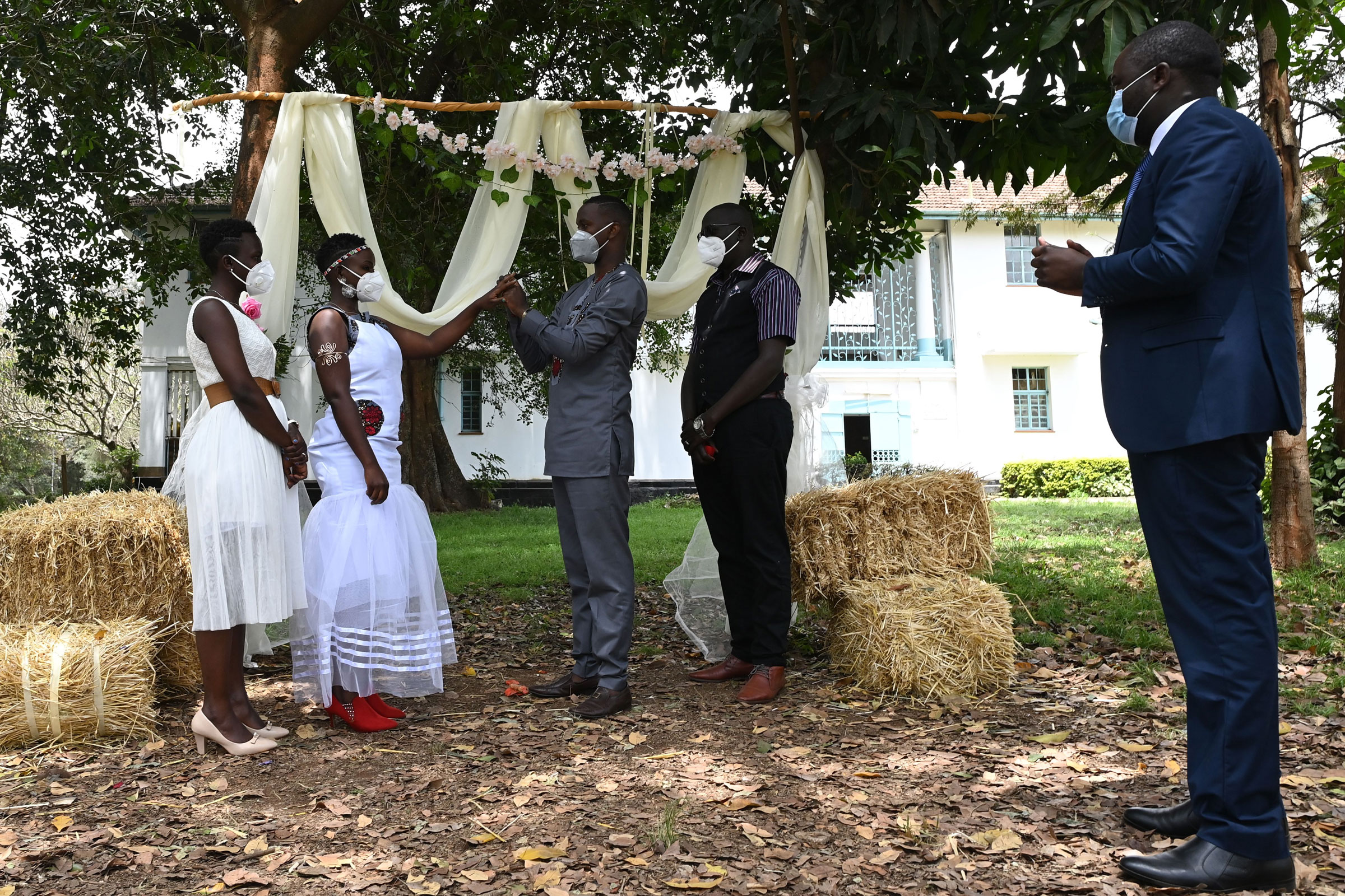 Charles Otieno and Jackline Adhiambo exchange rings during their wedding in Nairobi, Kenya, on Friday. The wedding, attended by just a few relatives, lasted for only 15 minutes because of coronavirus restrictions. Simon Maina/AFP/Getty Images