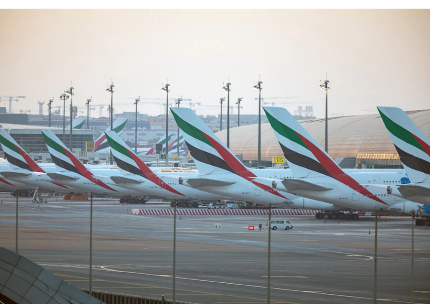 Passenger aircraft, operated by Emirates, stand beside the terminal building at Dubai International Airport May 18, 2020. (Christopher Pike/Bloomberg)