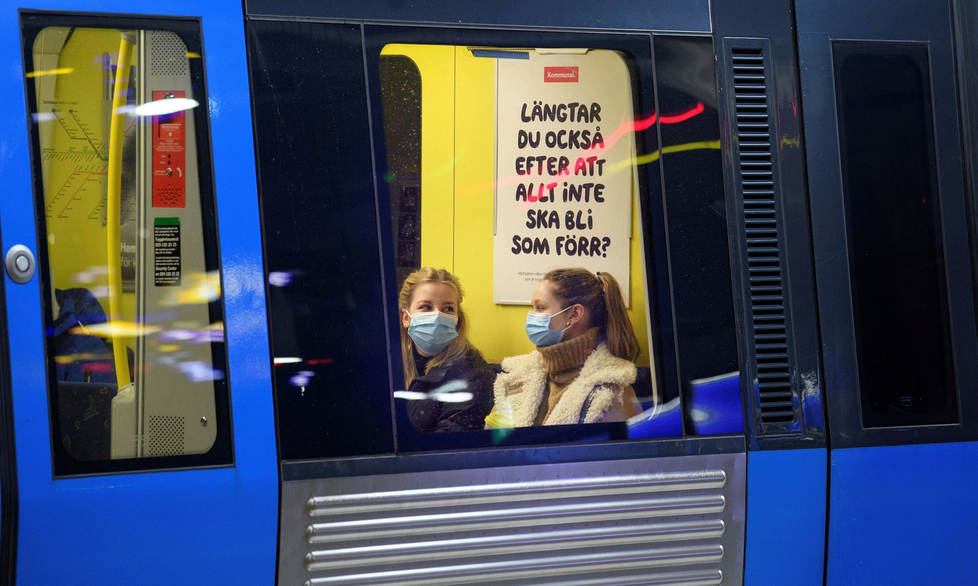 Passengers aboard an underground train in Stockholm, Sweden, which is to begin development of digital vaccine certificates for travel. Photograph: Tt News Agency/Reuters