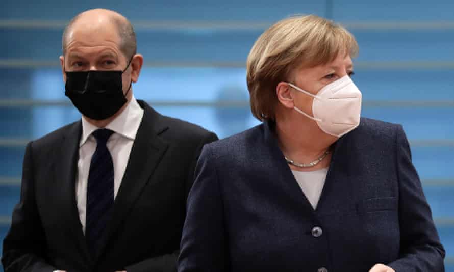 Olaf Scholz and Angela Merkel at a cabinet meeting on Wednesday. Photograph: Hayoung Jeon/EPA