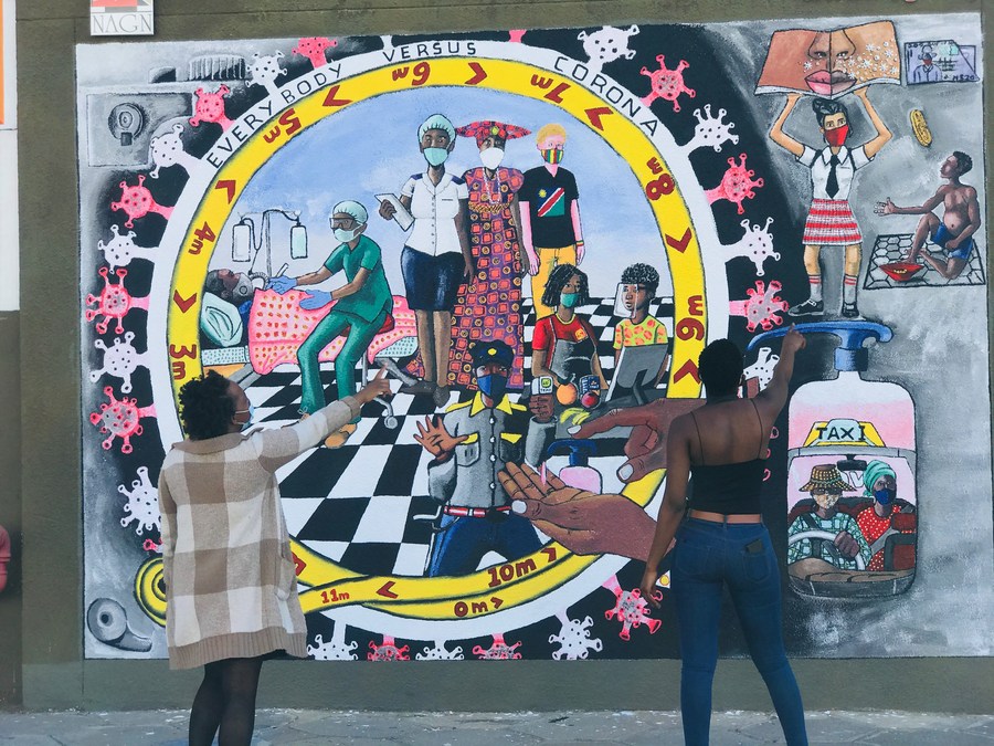 This file photo shows locals look at a mural featuring the Namibian people's fight against COVID-19 in Windhoek, Namibia, on Sept. 8, 2020. (Xinhua/Demetilie Amupolo)