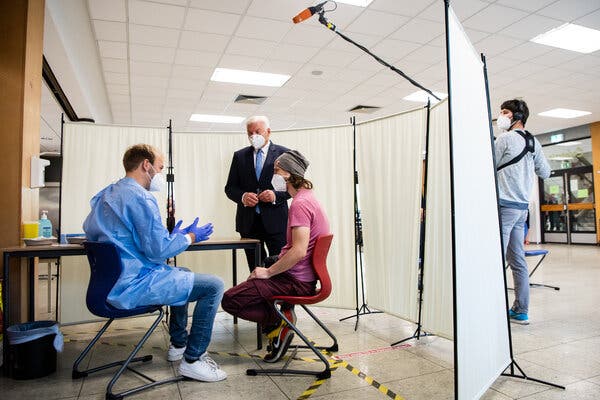President Frank-Walter Steinmeier of Germany, center left, at a pop-up vaccination center in a school in Berlin on Monday.Credit...Pool photo by Bernd von Jutrczenka
