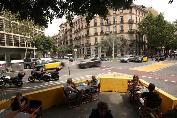 A restaurant terrace in Barcelona in July.Credit...Albert Gea/Reuters