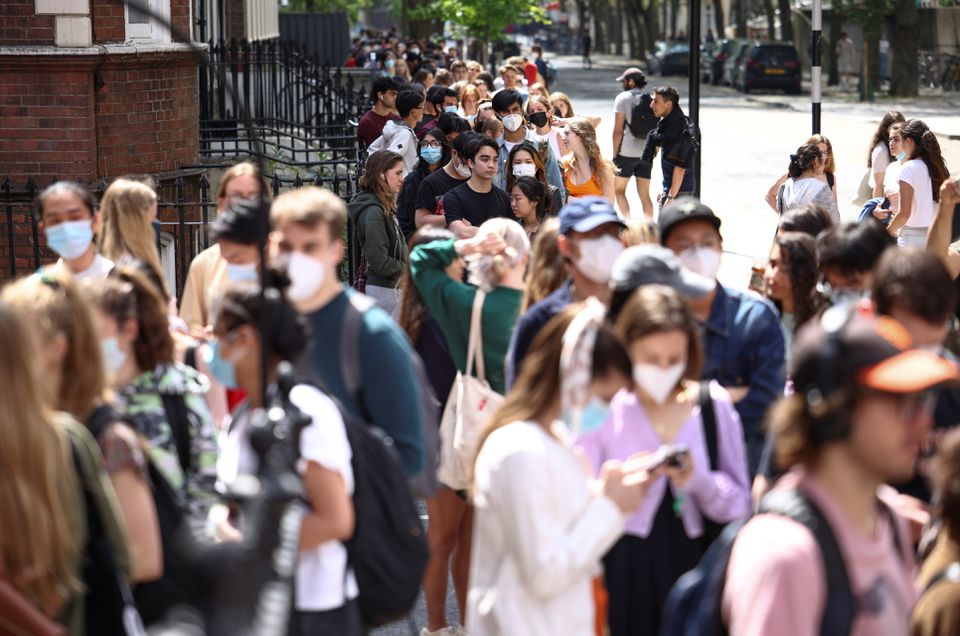 People queue outside a vaccination centre for young people and students at the Hunter Street Health Centre, amid the coronavirus disease (COVID-19) outbreak, in London, Britain, June 5, 2021. REUTERS/Henry Nicholls