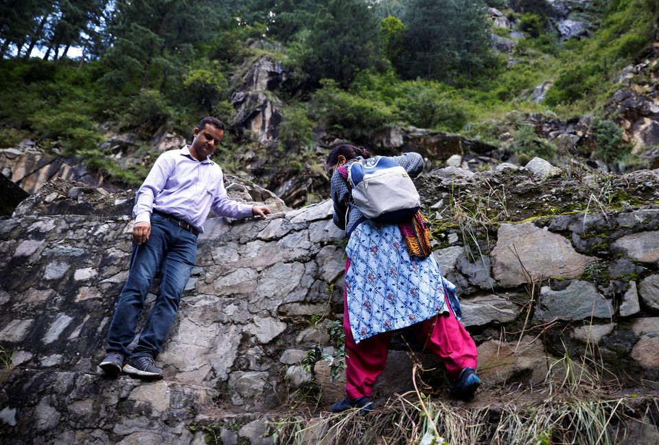 Blocked by the landslide, they left their vehicle with two blue vaccine boxes slung over their shoulders to manoeuvre over the rubble, climb the wall and then walk to the trailhead leading to the village, accompanied by a Reuters photographer.
