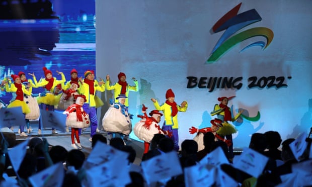 Performers at a ceremony revealing the Beijing 2022 slogan – ‘together for a shared future’ – earlier this month.Photograph: Tingshu Wang/Reuters