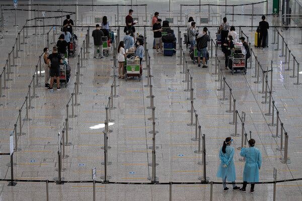 Travelers waited for shuttle buses to mandatory government-designated quarantine hotels in the arrival hall at Hong Kong International Airport in August.Credit...Jerome Favre/EPA, via Shutterstock