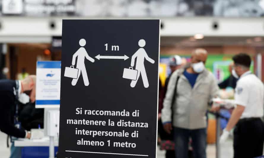 A social distancing sign in Rome on the third day of Italy’s first nationwide lockdown in March 2020. Photograph: Yara Nardi/Reuters