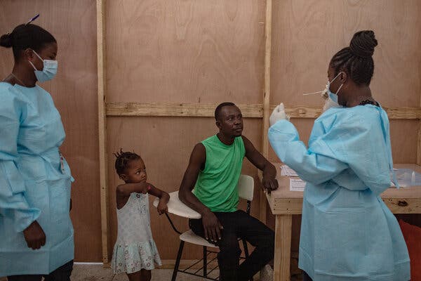 Nurses performing Covid-19 tests in July on people displaced by political upheaval in Port-au-Prince, Haiti.Credit...Victor Moriyama for The New York Times