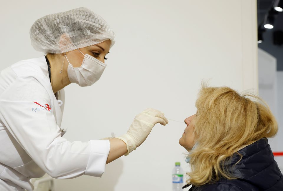 A woman undergoes a free coronavirus disease (COVID-19) rapid antigen test at a testing centre in the State Department Store, GUM, in Moscow, Russia October 18, 2021. REUTERS/Maxim Shemetov