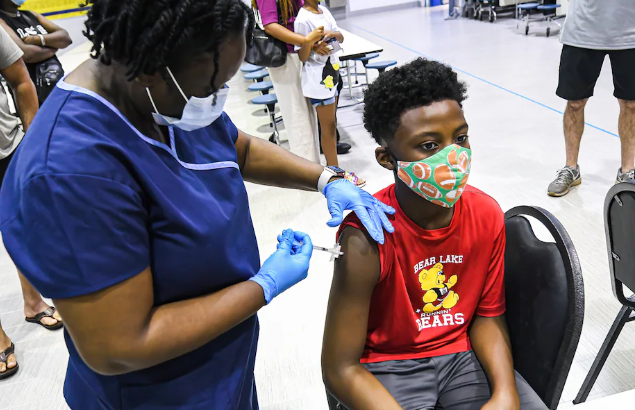 A nurse gives a boy a Pfizer-BioNTech coronavirus shot at a vaccine clinic at Lyman High School in Longwood, Fla., on the day before classes began for the 2021-22 school year. (Paul Hennessy/SOPA Images/LightRocket/Getty Images)