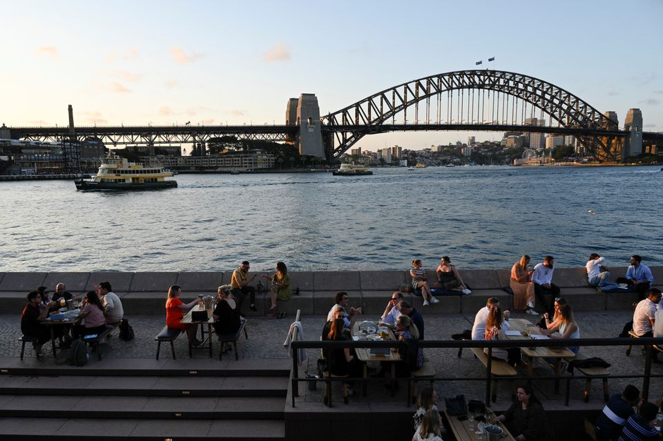 Patrons dine-in at a bar by the harbour in the wake of coronavirus disease (COVID-19) regulations easing, following an extended lockdown to curb an outbreak, in Sydney, Australia, October 22, 2021. REUTERS/Jaimi Joy