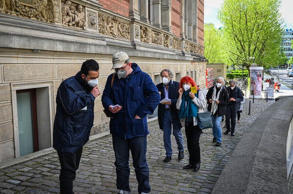 At the entrance of the Gropius Bau Museum in Berlin, visitors had to show a negative virus test or proof of vaccination to enter, in May.Credit...Lena Mucha for The New York Times