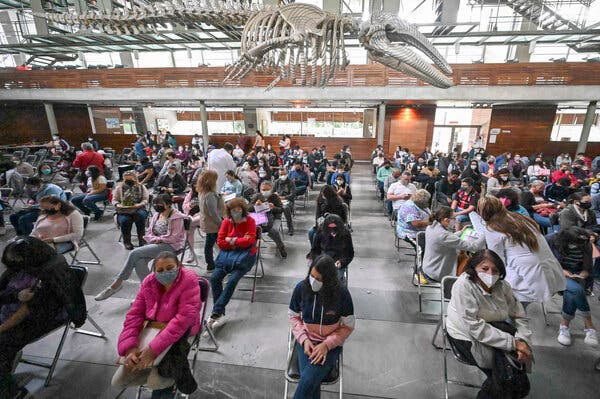 Under the watchful eye of a library dinosaur, minors and their families wait out their observation period after receiving the first dose of the Pfizer-BioNtech vaccine Monday in Mexico City.Credit...Alfredo Estrella/Agence France-Presse — Getty Images