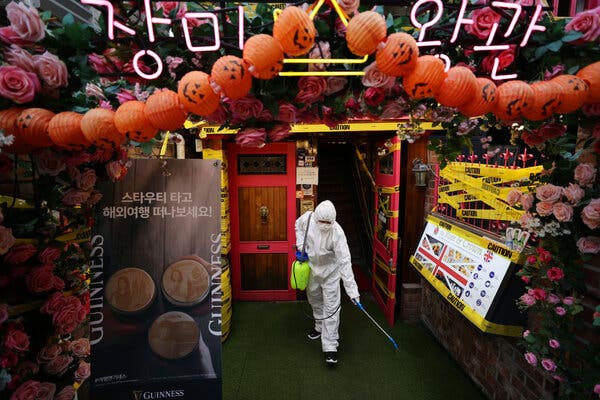Spraying disinfectant in Itaewon, a popular nightlife district in Seoul, last year ahead of Halloween.Credit...Yonhap/EPA, via Shutterstock
