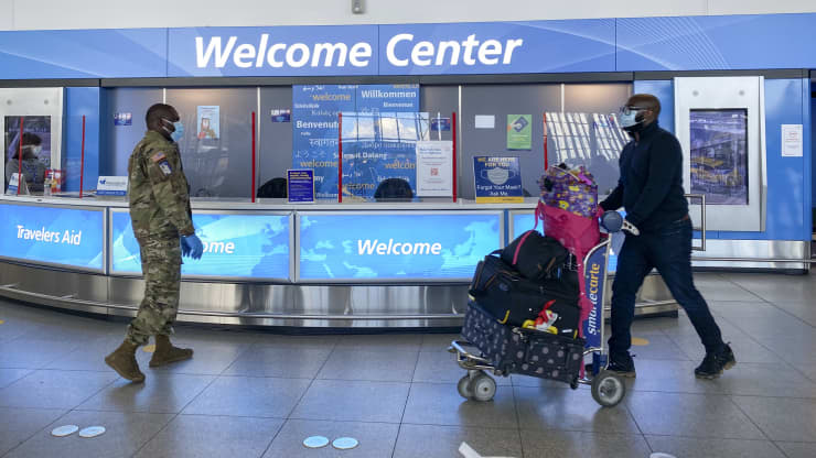 Military personal speak with travellers as they arrive at terminal 4 at JFK International airport in New York on December 22, 2020.