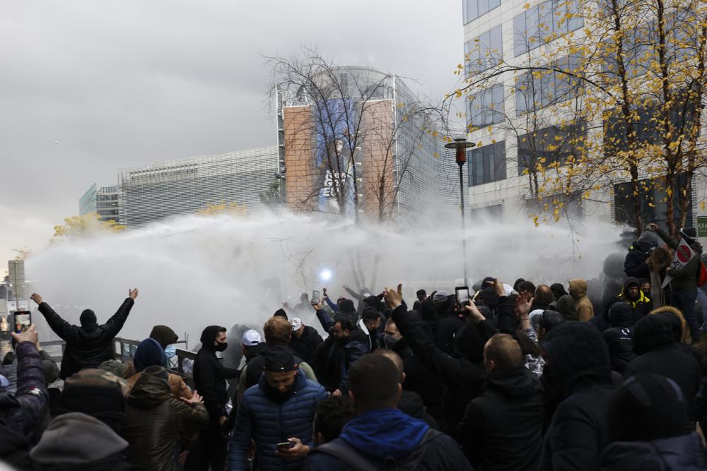 Riot police uses a water canon against protestors during a demonstration against the reinforced measures of the Belgium government to counter the latest spike of the coronavirus in Brussels, Belgium, Sunday, Nov. 21, 2021. Many among them also protested against the strong advice to get vaccinated and any moves to impose mandatory shots. (AP Photo/Olivier Matthys)