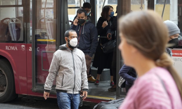 People alight from a bus in Rome, Italy, where masks remain compulsory on public transport.Photograph: Gregorio Borgia/AP