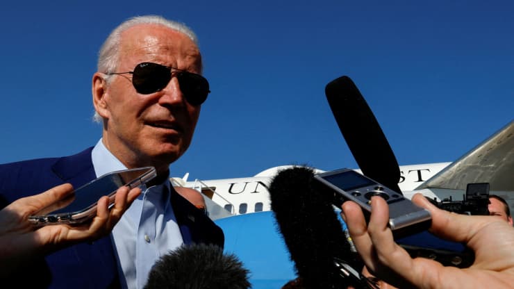 U.S. President Joe Biden speaks to the media as he arrives at Joint Base Andrews, Maryland, U.S. July 20, 2022.