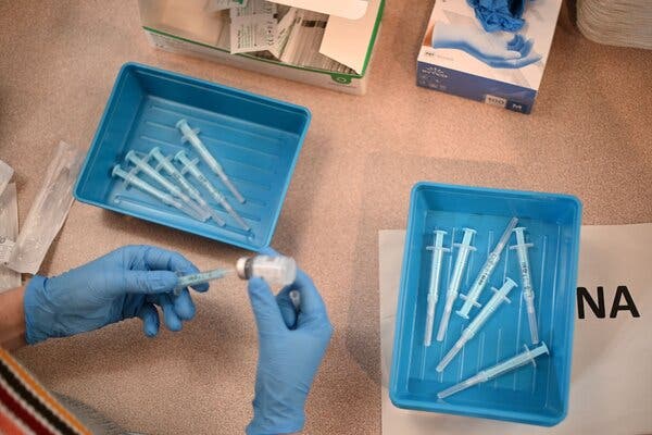 A clinician preparing doses of a Moderna vaccine at a vaccination center in London in December.Credit...Daniel Leal/Agence France-Presse — Getty Images