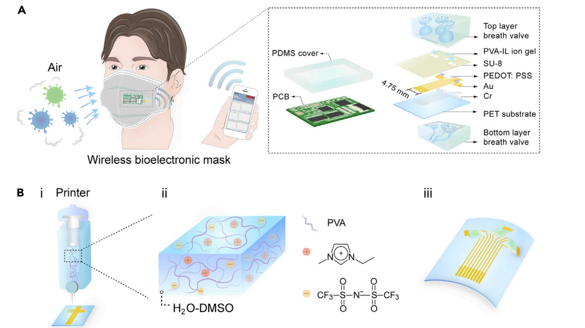 An illustration of design and application of the wireless bioelectronic mask (A) Schematic diagram of the bioelectronic mask device and the enlarged schematic illustration of a PIL-IGT, a breath valve, and a PCB. (B) Schematic diagram of (i) the fabrication process of PVA-IL ion gel as a dielectric layer of PIL-IGT by 3D printing, (ii) composition of PVA-IL ion gel, and (iii) flexible PIL-IGT. /Matter