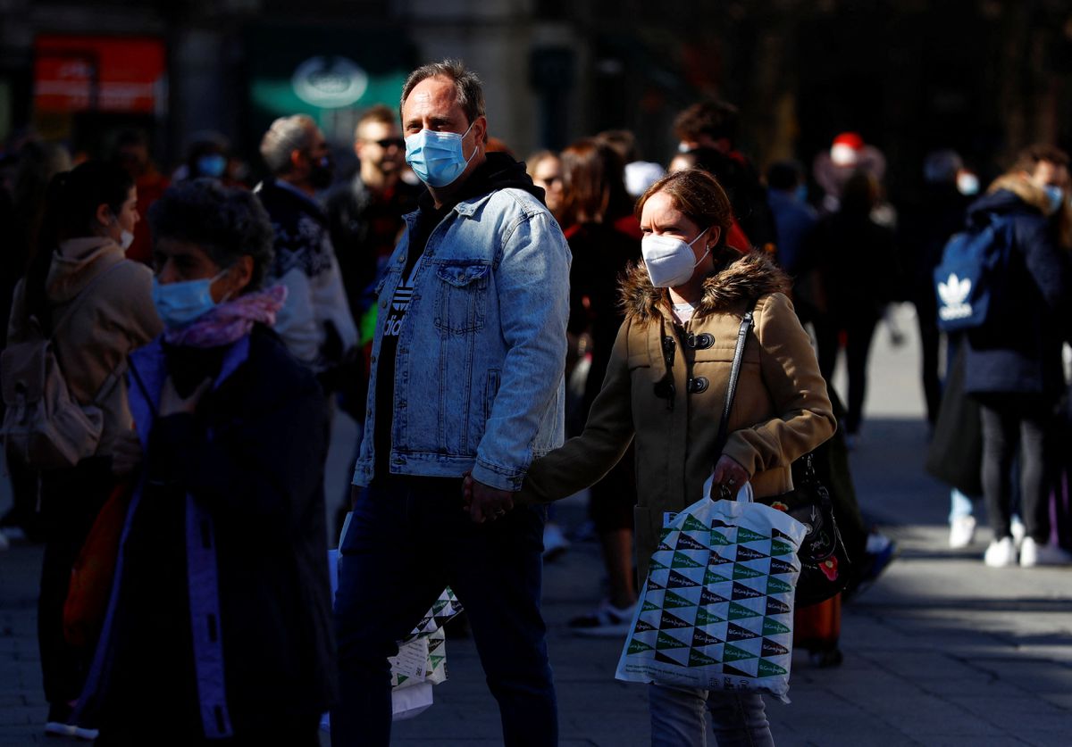 People wearing protective face masks walk down a street in Madrid, Spain, February 7, 2022. REUTERS/Borja Suarez