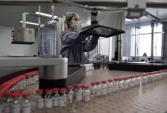 An employee works on the production line of CanSino Biologics Inc's single-dose vaccine against the coronavirus disease (COVID-19) in Tianjin, China April 25, 2021. Picture taken April 25, 2021. China Daily via REUTERS ATTENTION EDITORS - THIS IMAGE WAS PROVIDED BY A THIRD PARTY. CHINA OUT.