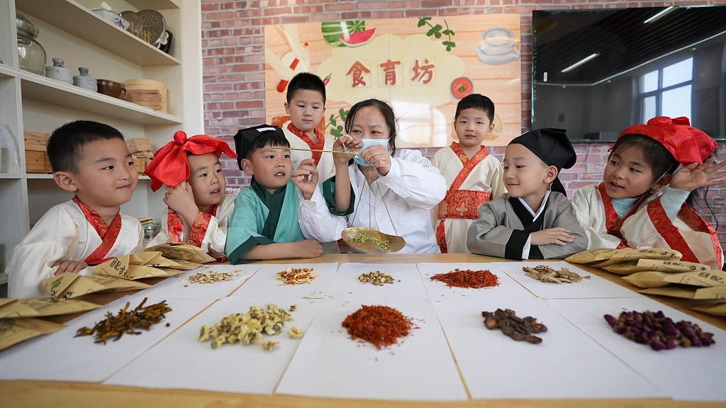 A pharmacist teaches children to recognize Chinese herbs at a kindergarten in Xingtai, Hebei Province. /CFP