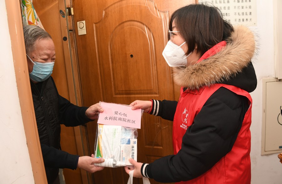A community worker (R) hands a care package to a resident in a community in Yangfangdian Subdistrict of Haidian District in Beijing, capital of China, Dec. 27, 2022. (Xinhua/Ren Chao)